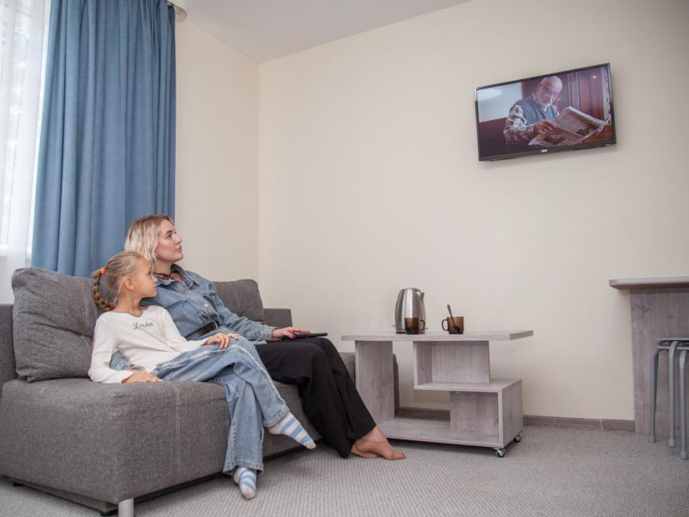 Номер с двумя кроватями спринг-бокс 80х200 и диваном. В номере: шкаф - купе, мини-бар холодильник, телевизор, стол журнальный, электрический чайник, чайные пары, чайные ложки, плотные шторы для затемнения в номере.