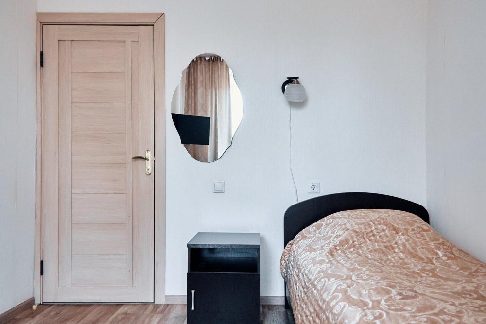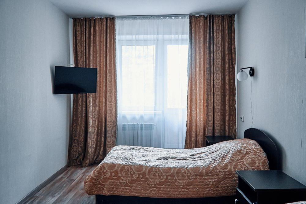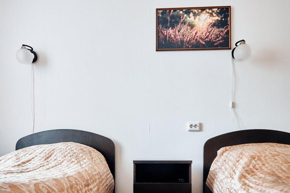 В номере одна односпальная кровать и 2-спальная кровать, кресло, тумбочка, телевизор, посуда. Встроенный шкаф для одежды, холодильник, чайник, фен, гладильная доска, утюг. удобства общие на этаже.