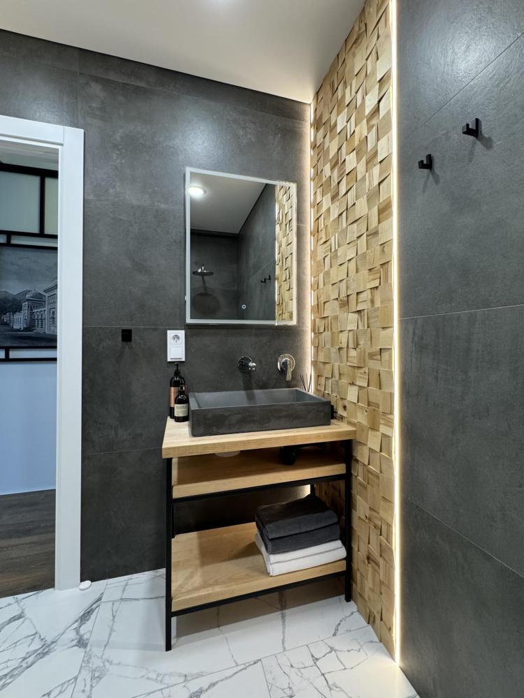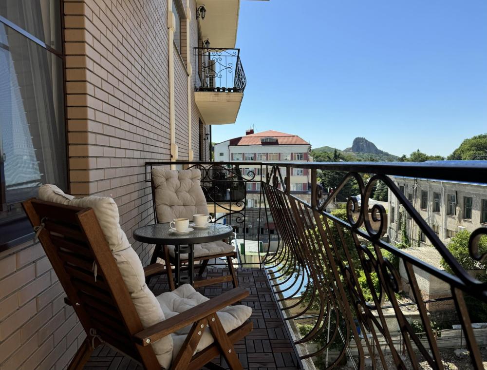 Апартаменты площадью 90 кв.м. находятся на 6 этаже девятиэтажного здания и включают в себя столовую с кухонным гарнитуром и диваном, две изолированные спальни с видом на горы и своими санузлами в разных частях апартаментов, кроватью размера king size и кроватью с возможностью разделения на две односпальные. Балкон с видом на горы оборудован столиком и мягкими креслами-шезлонгами. Прихожая инсталлирована велосипедами для прогулок по терренкурам. Апартаменты оснащены беспроводным интернетом, видеонаблюдением, кондиционерами и индивидуальным отоплением с системой теплый пол. Техника : индукционная плита, микроволновая печь с грилем, посудомоечная машина, автоматическая кофемашина, кофемашина для турецкого кофе, холодильник, утюг, вертикальный пылесос, робот пылесос с функцией самоочистки, стиральная машина, сушильная машина, фены, Smart телевизоры. Гостям предоставляется постельное белье, полотенца, халаты и тапочки. Бесплатная парковка под домом с освещением и шлагбаумом.
